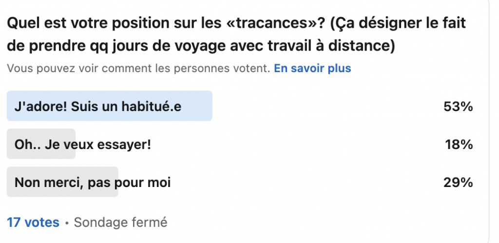 Visiblement, il y a de l’appétit pour une telle pratique. Dans ce contexte, les tracances peuvent permettre à ces travailleurs de prolonger leur voyage de quelques jours. Toutefois, en interrogeant les répondants à notre sondage, il appert que la pratique n’est pas être totalement normalisée dans les entreprises.